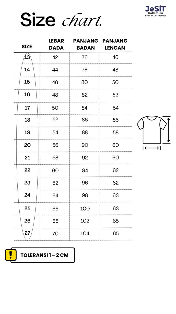 SERAGAM BATIK SMA PEREMPUAN - Merk JeSiT Collection | 100% ORI Bahan : Katun Prima 40'S Kain Batik ORI JSIT Bahan Berkualitas Kelebihan Produk : 1. Model tunik yang elegan dan sopan (2 katong di depan bagian bawah) 2. Motif batik khas JSIT mencerminkan identitas Sekolah Anggoat Jaringan Sekolah Islam Terpadu (JSIT) 3. Aksesoris eksklusif merk Jesit 4. Merk Jesit menjamin kualitas dan desain. Ukuran Baju Akhwat/Perempuan SMA : LD = Lebar Dada PB = Panjang Baju Toleransi Ukuran 1-3 cm 13 : LD 42 cm/ PB 76 cm/ PL 46 cm 14 : LD 44 cm/ PB 78 cm/ PL 48 cm 15 : LD 46 cm/ PB 80 cm/ PL 50 cm 16 : LD 48 cm/ PB 82 cm/ PL 52 cm 17 : LD 50 cm/ PB 84 cm/ PL 54 cm 18 : LD 52 cm/ PB 86 cm/ PL 56 cm 19 : LD 54 cm/ PB 88 cm/ PL 58 cm 20 : LD 56 cm/ PB 90 cm/ PL 60 cm 21 : LD 58 cm/ PB 92 cm/ PL 60 cm 22 : LD 60 cm/ PB 94 cm/ PL 62 cm 23 : LD 62 cm/PB 96 cm/ PL 62 cm 24 : LD 64 cm/PB 98 cm/ PL 63 cm 25 : LD 66 cm/ PB 100 cm/ PL 63 cm 26 : LD 68 cm/ PB 102 cm/ PL 65 cm 27 : LD 70 cm/ PB 104 cm/ PL 65 cm DIlluar ukuran tersebut bisa hubungi admin ya kak Kelebihan TOKO : 1. Produk dijamin original dan berkualitas unggul. 2. Pelayanan pelanggan responsif dan siap membantu, memastikan pengalaman belanja yang memuaskan 3. Untuk pemesanan custom harus minimal pembelanjaan selusin. 4. Tersedia toko offline.