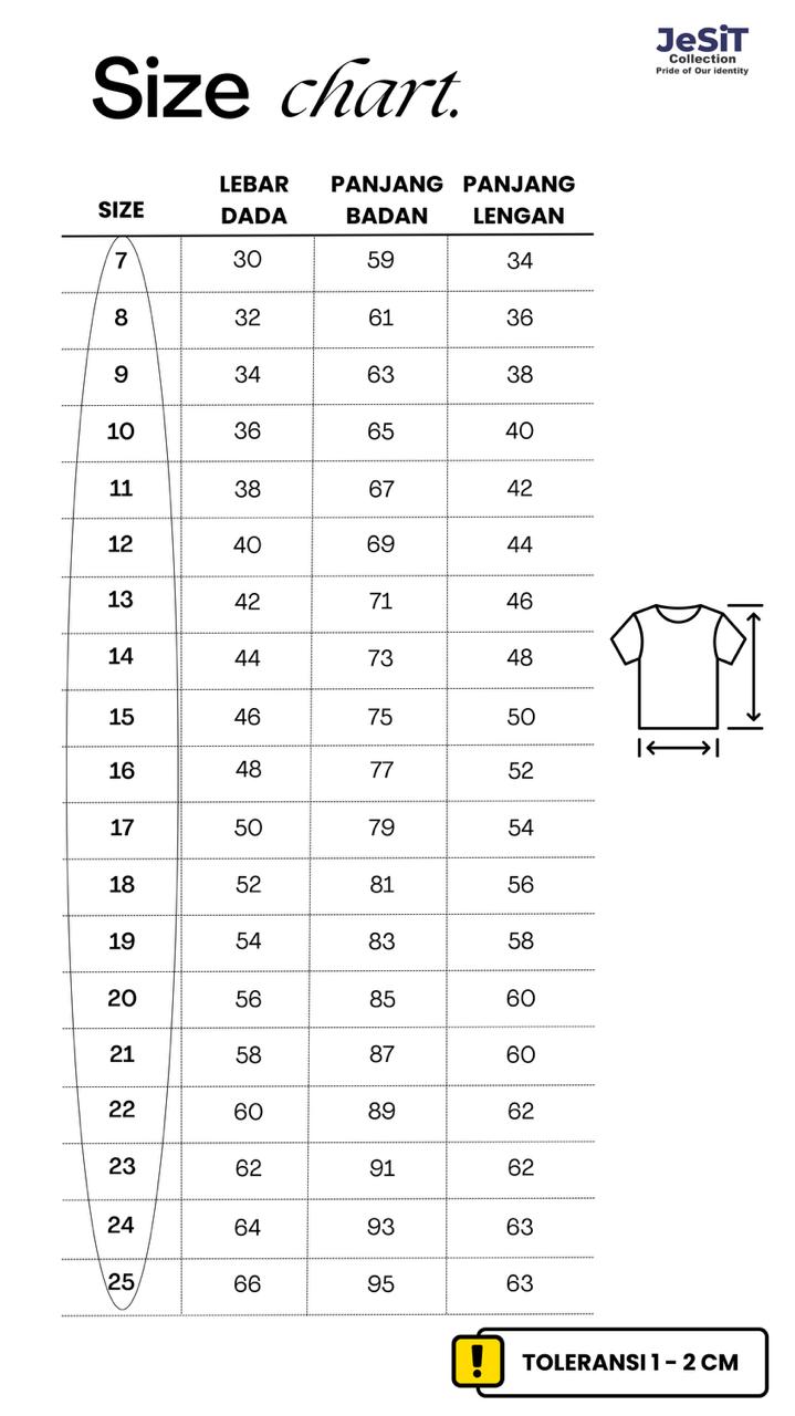 SERAGAM BATIK SD PEREMPUAN - Merk JeSiT Collection | 100% ORI Bahan : Katun Prima 40'S Kain Batik ORI JSIT Bahan Berkualitas Kelebihan Produk : 1. Model tunik yang elegan dan sopan. 2. Motif batik khas JSIT mencerminkan identitas Sekolah Anggoat Jaringan Sekolah Islam Terpadu (JSIT) 3. Aksesoris eksklusif merk Jesit 4. Merk Jesit menjamin kualitas dan desain. Ukuran Baju Akhwat/Perempuan SD : LD : Lebar Dada PB = Panjang Baju Toleransi Ukuran 1-3 cm 7 : LD 30 cm/ PB 59 cm/ PL 34 cm 8 : LD 32 cm/ PB 61 cm/ PL 36 cm 9 : LD 34 cm/ PB 63 cm/ PL 38 cm 10 : LD 36 cm/ PB 65 cm/ PL 40 cm 11 : LD 38 cm/ PB 67 cm/ PL 42 cm 12 : LD 40 cm/ PB 69 cm/ PL 44 cm 13 : LD 42 cm/ PB 71 cm/ PL 46 cm 14 : LD 44 cm/ PB 73 cm/ PL 48 cm 15 : LD 46 cm/ PB 75 cm/ PL 50 cm 16 : LD 48 cm/ PB 77 cm/ PL 52 cm 17 : LD 50 cm/ PB 79 cm/ PL 54 cm 18 : LD 52 cm/ PB 81 cm/ PL 56 cm 19 : LD 54 cm/ PB 83 cm/ PL 58 cm 20 : LD 56 cm/ PB 85 cm/ PL 60 cm 21 : LD 58 cm/ PB 87 cm/ PL 60 cm 22 : LD 60 cm/ PB 89 cm/ PL 62 cm 23 : LD 62 cm/ PB 91 cm/ PL 62 cm 24 : LD 64 cm/ PB 93 cm/ PL 63 cm 25 : LD 66 cm/ PB 95 cm/ PL 63 cm DIlluar ukuran tersebut bisa hubungi admin ya kak Kelebihan TOKO : 1. Produk dijamin original dan berkualitas unggul. 2. Pelayanan pelanggan responsif dan siap membantu, memastikan pengalaman belanja yang memuaskan 3. Untuk pemesanan custom harus minimal pembelanjaan selusin. 4. Tersedia toko offline.