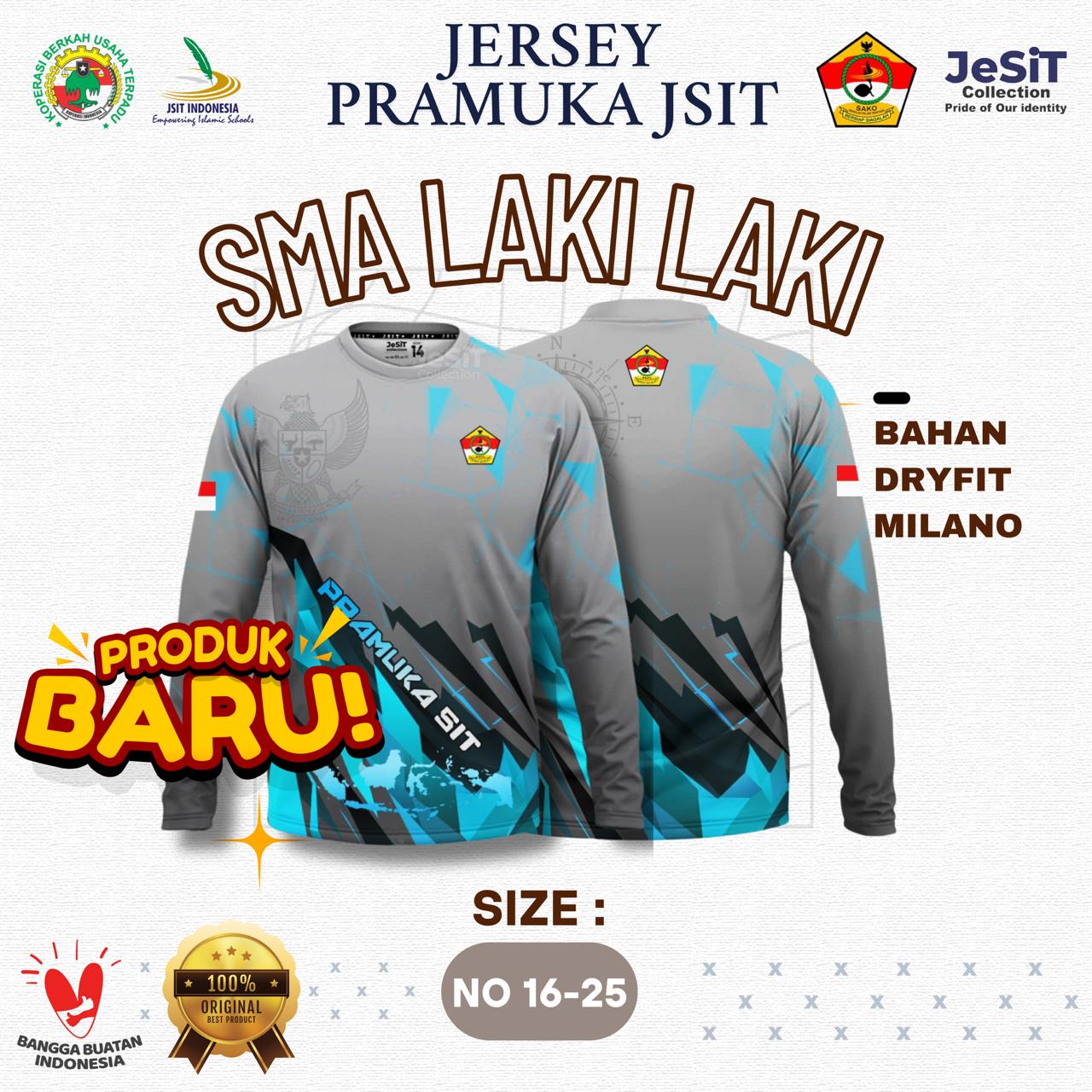 JERSEY SAKO PRAMUKA JSIT INDONESIA Jersey ini ditujukan untuk kegiatan SAKO Pramuka JSIT Indonesia yang dirancang khusus untuk mendukung kegiatan Pramuka yang aktif, modern, dan berkarakter. Mengusung tema Garuda & Compass Edition, desain memadukan simbol nasionalisme dan kepemimpinan dalam tampilan sporty yang elegan dan profesional. * Spesifikasi Jersey SAKO Pramuka JSIT Indonesia: 1. Model: Lengan Panjang 2. Bahan: Dryfit Milano (adem & breathable) 3. Teknik: Full Printing Sublimasi (warna tidak mudah luntur) 4. Cutting: Sporty Fit (nyaman untuk aktivitas outdoor) 5. Leher: O-Neck kombinasi warna kontras 6. Jahitan rapi & kuat * Keunggulan Produk: 1. Desain eksklusif & tidak pasaran 2. Nyaman dipakai seharian 3. Ringan & cepat menyerap keringat 4. Cocok untuk kegiatan Indoor dan Ourdoor 5. Bisa custom nama & instansi